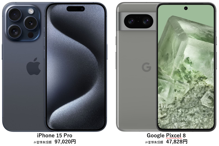 「いつでもカエドキプログラム」適用すれば、iPhone 15 Proは97,020円、Google Pixel 8なら47,828円で購入することが可能です。